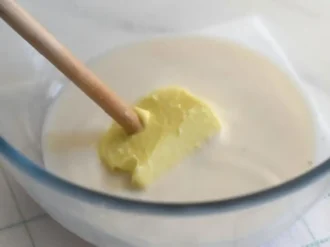 Тепле молоко (35-40°C) наливаємо в миску, розчиняємо в ньому цукор, сіль і сухі дріжджі.
