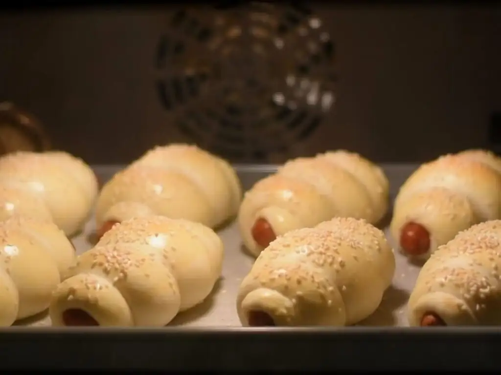 Випікаємо сосиски в тісті 20 хвилин за температури 190°C, у попередньо розігрітій духовці.