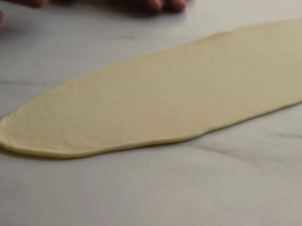 Кожну кульку з тіста необхідно розкачати в довжину, отримавши на столі подовжений тонкий лист, як на фото.