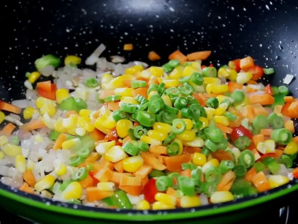 Моркву, перець, квасолю ріжемо на невеликі шматочки і, разом із кукурудзою, додаємо до цибулі. Смажимо, помішуючи, кілька хвилин.