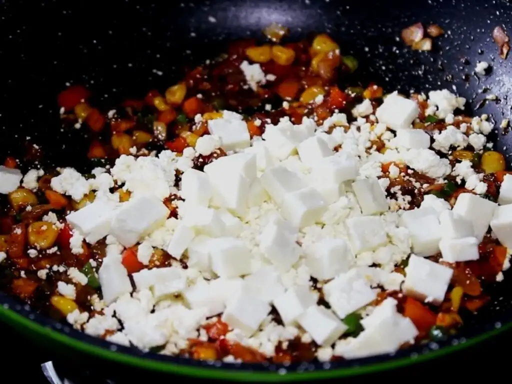 Адигейський сир попередньо ділимо навпіл: одну частину тремо на тертці, а другу - ріжемо невеликими кубиками. Вимикаємо вогонь під сковорідкою і, поки овочева суміш ще гаряча, додаємо в неї сир і перемішуємо.