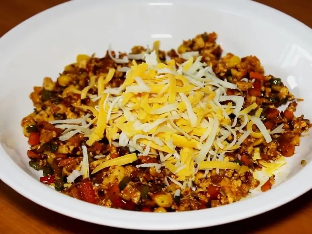 Викладаємо суміш зі сковороди на тарілку, даємо охолонути. Потім змішуємо з натертою моцарелою та чеддером