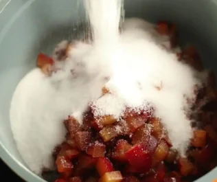 Кладемо сливи в антипригарний сотейник, засипаємо цукор і перемішуємо дерев'яною лопаткою. Додаємо корицю, потім переставляємо каструлю на плиту.