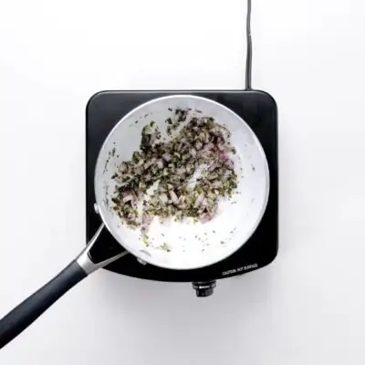 Розтопити вершкове масло в невеликій каструлі на середньому вогні. Додайте цибулю і готуйте, поки вона не стане м'якою, близько 5 хвилин. Додайте часник і готуйте до появи аромату, близько 30 секунд.